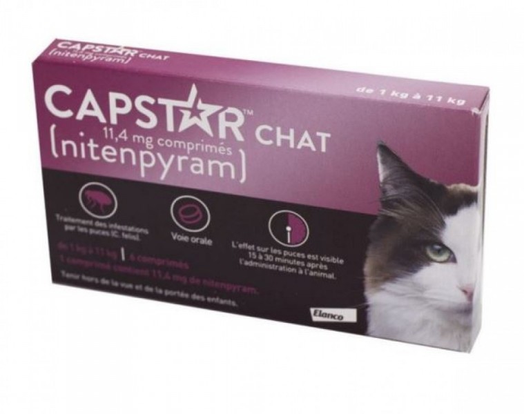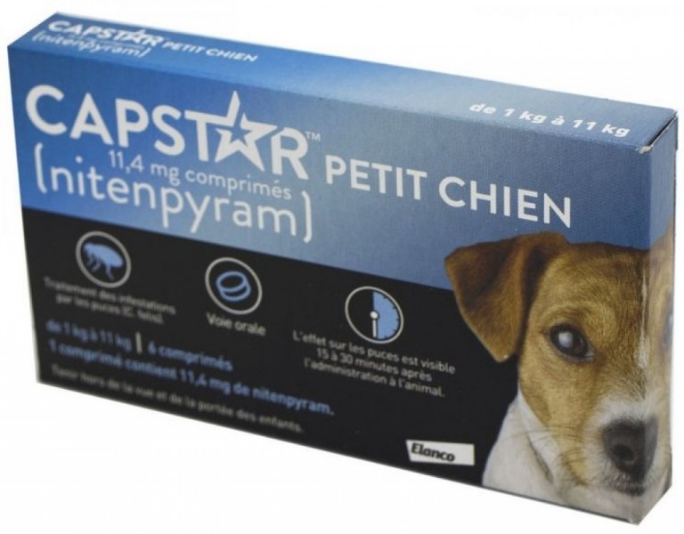 Capstar 11,4 mg petit chien est un médicament à usage vétérinaire sous forme de comprimés indiqué dans le traitement des infestations par les puces (Ctenocephalides felis). Il a été formulé pour traiter les chiens de petit gabarit, pesant entre 1 et 11 kilos. Le principe actif de ce traitement anti puces, le nitenpyram, appartient à la classe des néonicotinoïdes. Il agit en se liant aux récepteurs cholinergiques de type nicotinique spécifiques des insectes en les inhibant. Ce mode d'action a pour effet d'interrompre la conduction nerveuse chez la puce adulte, ce qui entraîne sa mort. L'effet de Capstar 11,4 mg petit chien sur les puces est observable dans les 15 à 30 minutes qui suivent l'administration du comprimé au chien atteint par l'infestation. Il s'agit d'un traitement anti puces, à utiliser lorsqu'une infestation est clairement identifiée, et non en prévention. La fréquence du traitement dépend essentiellement du degré de l'infestation. Si celle-ci est sévère, il peut être nécessaire de traiter le chien chaque jour ou un jour sur deux, jusqu'à l'élimination totale des parasites. En cas de récidive, le traitement Capstar 11,4 mg peut être répété. Les comprimés Capstar 11,4 mg doivent être administrés au chien infesté par les puces par voie orale, avec ou sans nourriture. Nous vous recommandons de dissimuler le comprimé dans un aliment apprécié de votre animal afin d'en faciliter l'ingestion.